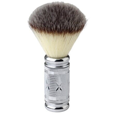 Štětka na holení v moderním designu s kovovou rukojetí. Štětka má vlasy vyrobeny ze syntetického vlákna, které má velmi podobné vlastnosti jako jezevčí vlasy. Je určena pro všechny, kteří preferují tento materiál pro své veganské vlastnosti a mají rádi příjemný masážní efekt při holení. Tvarování rukojeti umožňuje zavěšení štětky do stojánku.